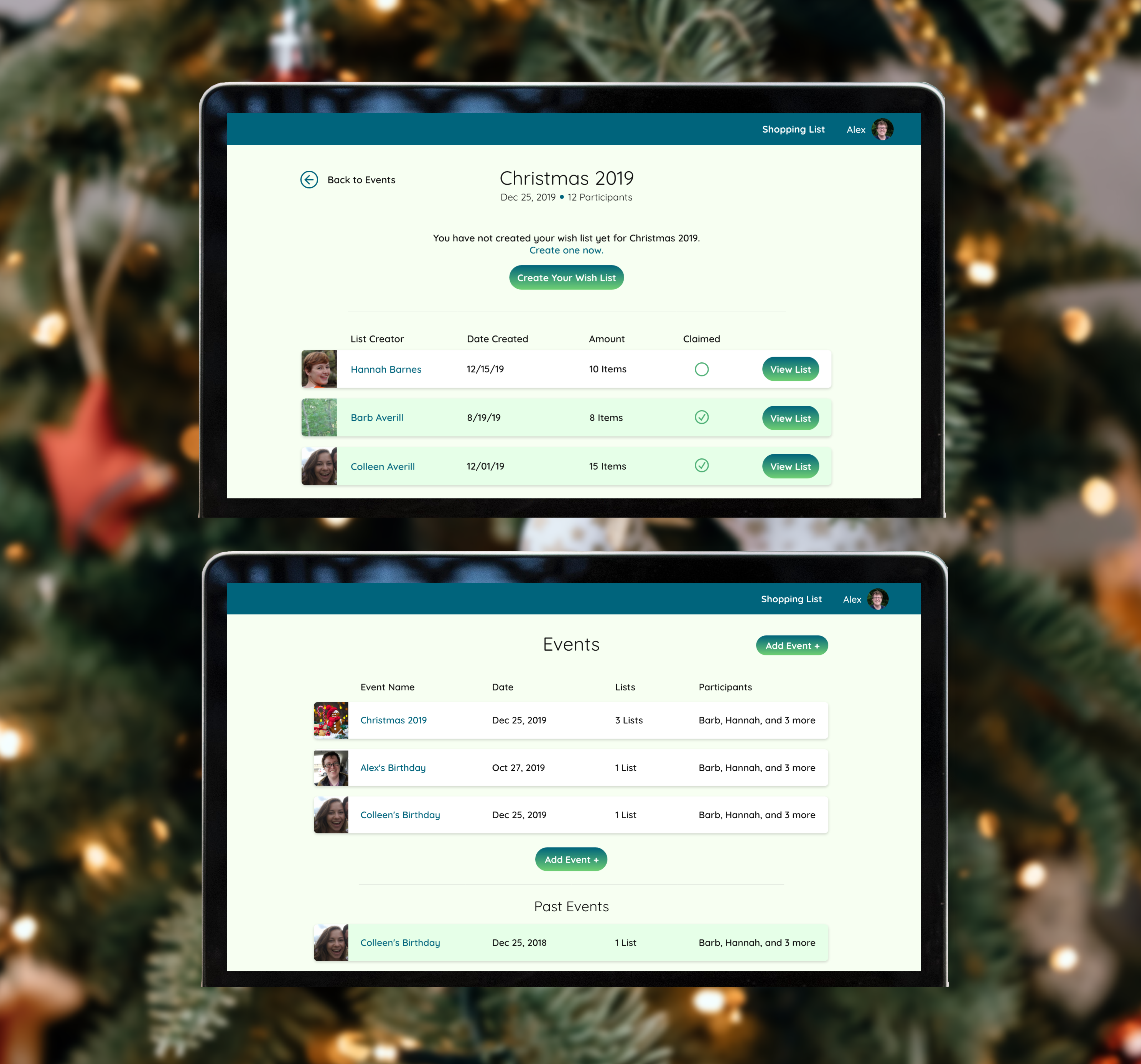 After logging in, users are presented with a list of events, such as birthdays, graduations, and Christmas. Most events are focused on a single gift recipient, but events like Christmas are made up of multiple wishlists from different people.